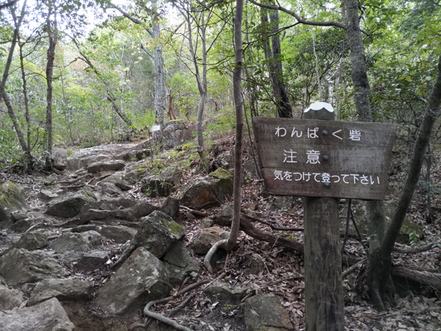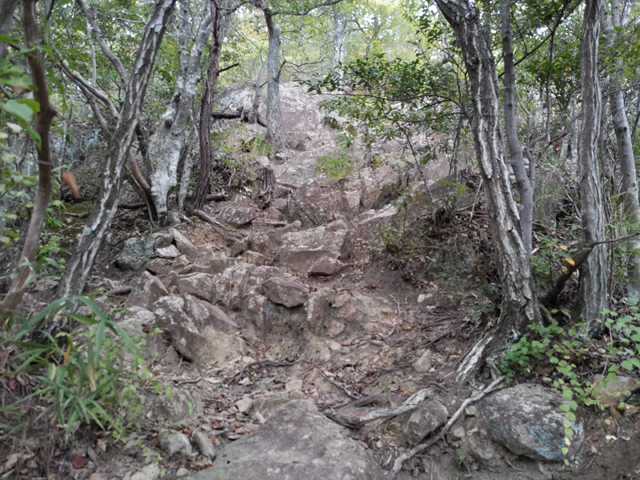 北西方面の下山路も岩が多く歩き辛い、岩区間が終わると階段。