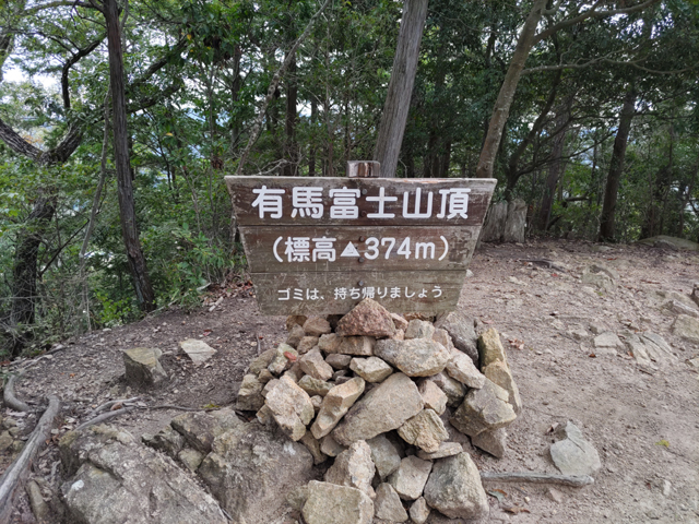 その上の有馬富士山頂(374m)には11時34分到着、直下の景色の良い岩で昼飯休憩。