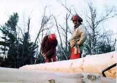 トップのノッチをカットする。10時頃から雨が降り始め、11時で作業が一時中断となった。昼から再開するが降ったり止んだりで効率が上がらず、今日はカットしたログを乗せて、スカーフを切り落とした所で雨が強くなり、時間も4時近かったので終了した。何か疲れた一日だった。腰がずいぶん痛む。