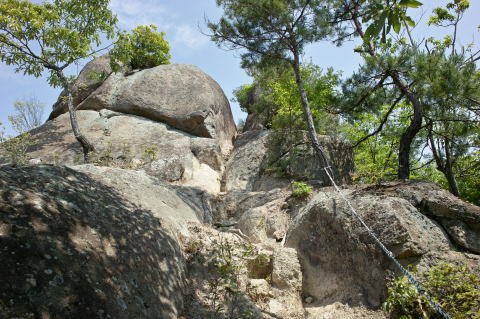 暫く進むとロープの上に「屏風岩」、更に上の「観音様の腰掛岩」から周囲の景色が広がる。