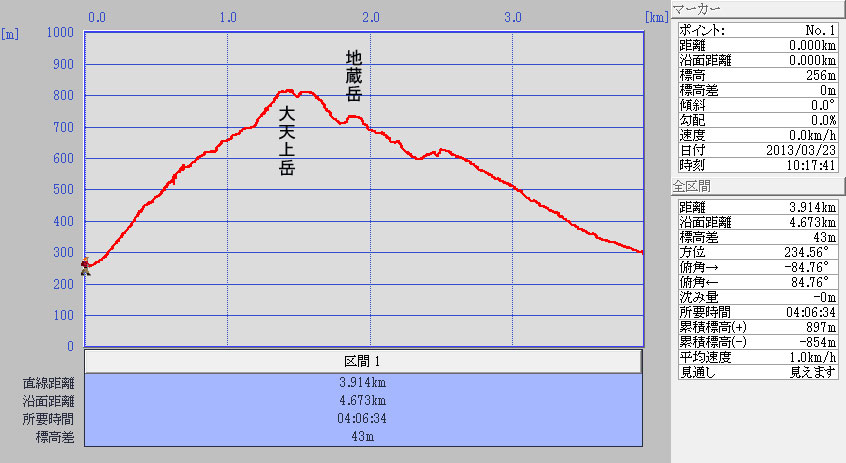 駐車場 10:20 - 出雲岩 11:12 - 大天上岳 11:50 - 12:20 - 地蔵岳 12:55 - 虹ヶ滝 13:33 - 駐車場 14:28