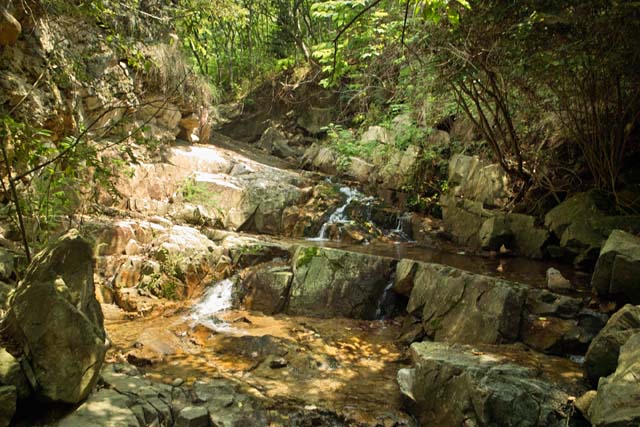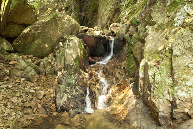 | 深い滝つぼの極小滝 | 穏やかな流れだが巨石もある |