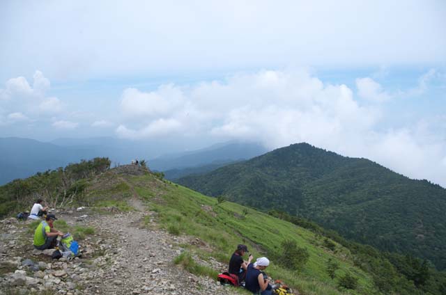 尾根を登り切って、コヤマノ岳到着、草地に座り風を受けながら一服する。