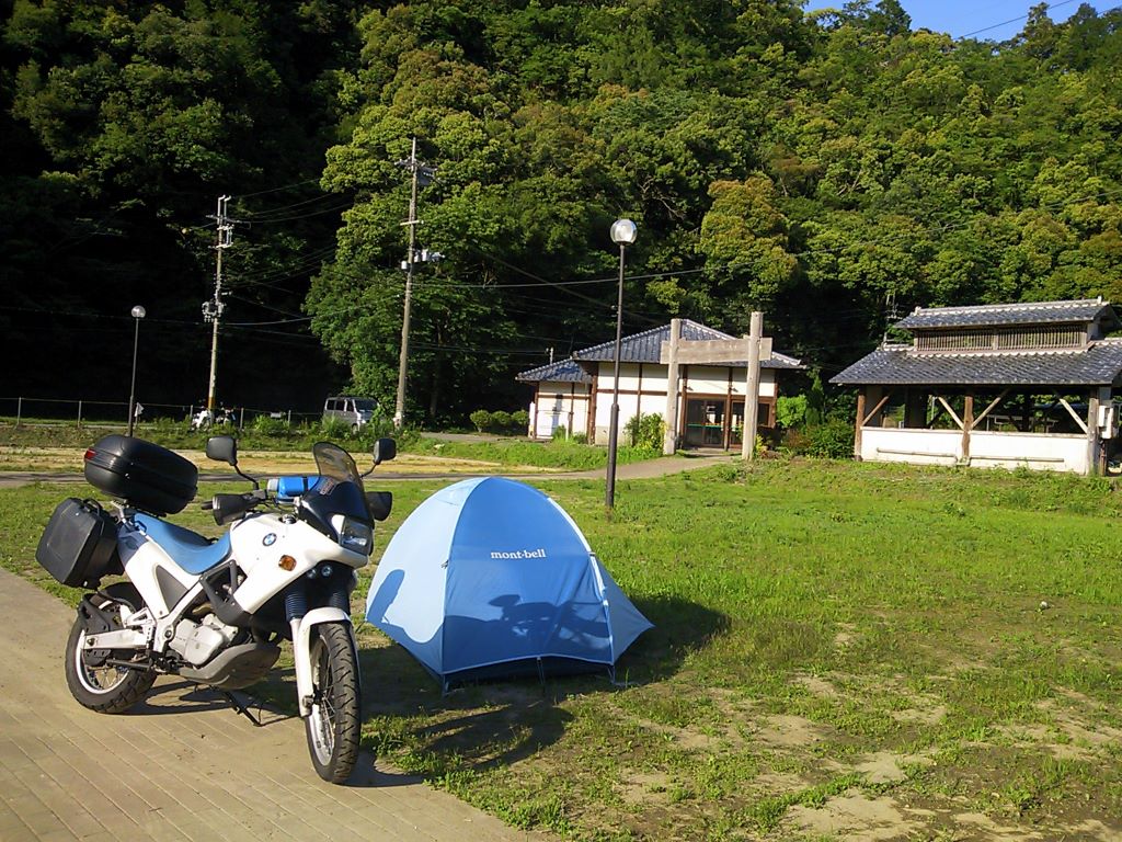 右手にバイクサイトが新設中で荷物運ぶのが面倒なのでそこにテント設営。