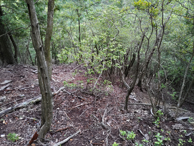 適当に上を目指し登る、落ち葉の下の土が柔らかく滑りやすいので結構しんどい。