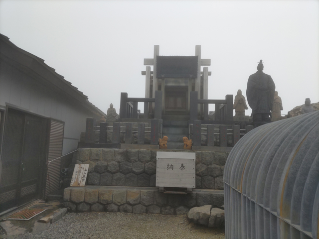最後の階段を登り、10時26分剣ヶ峰山頂到着、相変わらずガスで景色なし。
