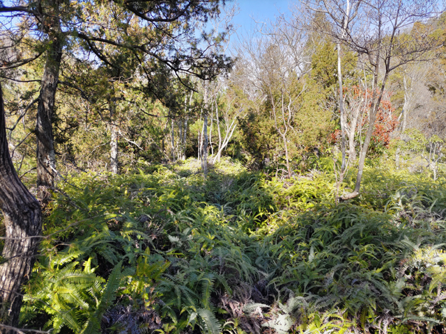 分岐までの登りがあるだけなので下山は楽であるが、羊歯の藪漕ぎが待っている、、、。