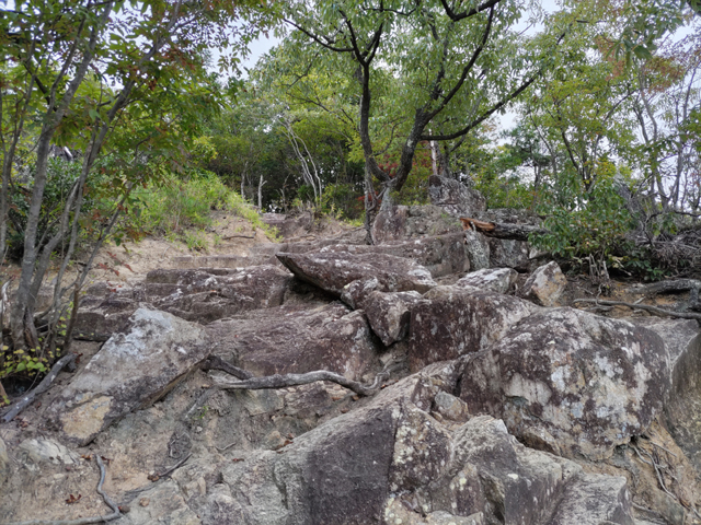 北西方面の下山路も岩が多く歩き辛い、岩区間が終わると階段。